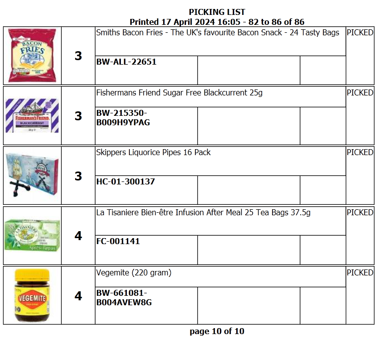 The picking list groups items by product or location, with a space to confirm each product has been picked.
